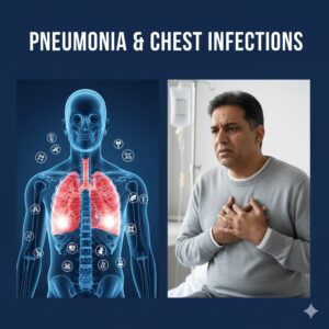 We manage both community-acquired pneumonia (CAP) and hospital-acquired pneumonia (HAP) using modern diagnostic tools, chest imaging, and evidence-based medications for safe and fast recovery.